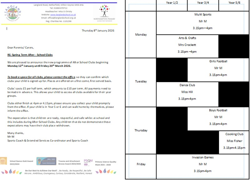 RE: Spring Term After - School Clubs